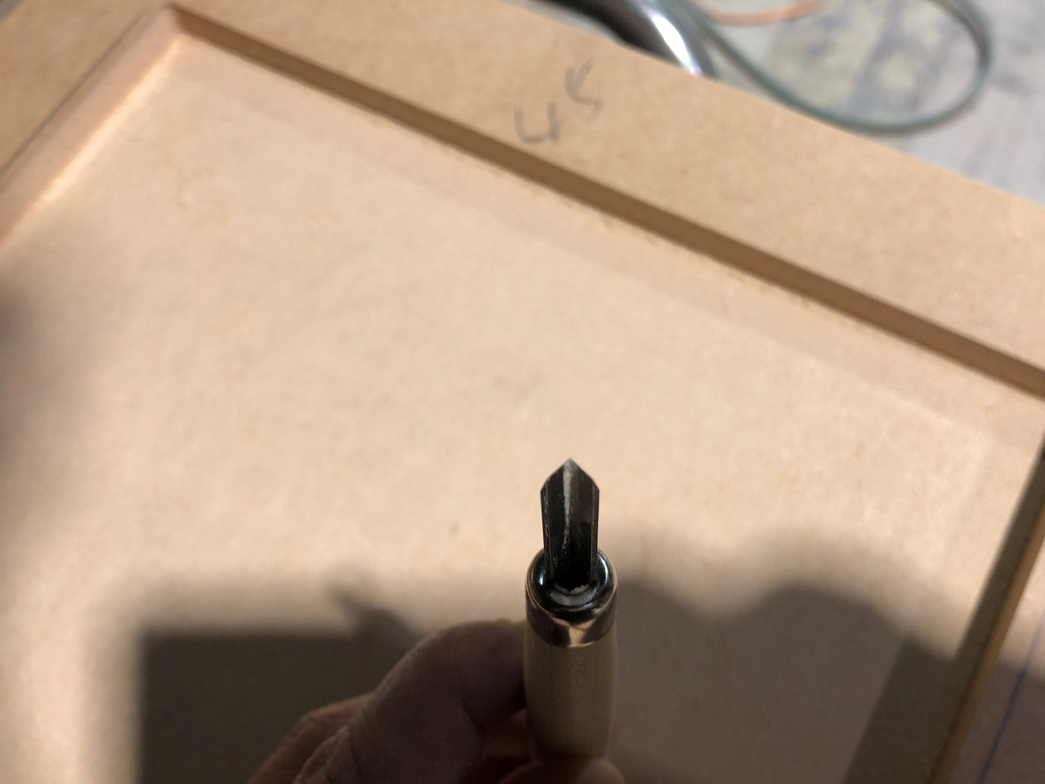この扉は引き出しの前板になるのですが材料はMDFを基材にして掘り込み加工をしました。今回塗装をする予定なのでこの様なつるつるな材料が塗装に向いてるためこの材料を使用しました。