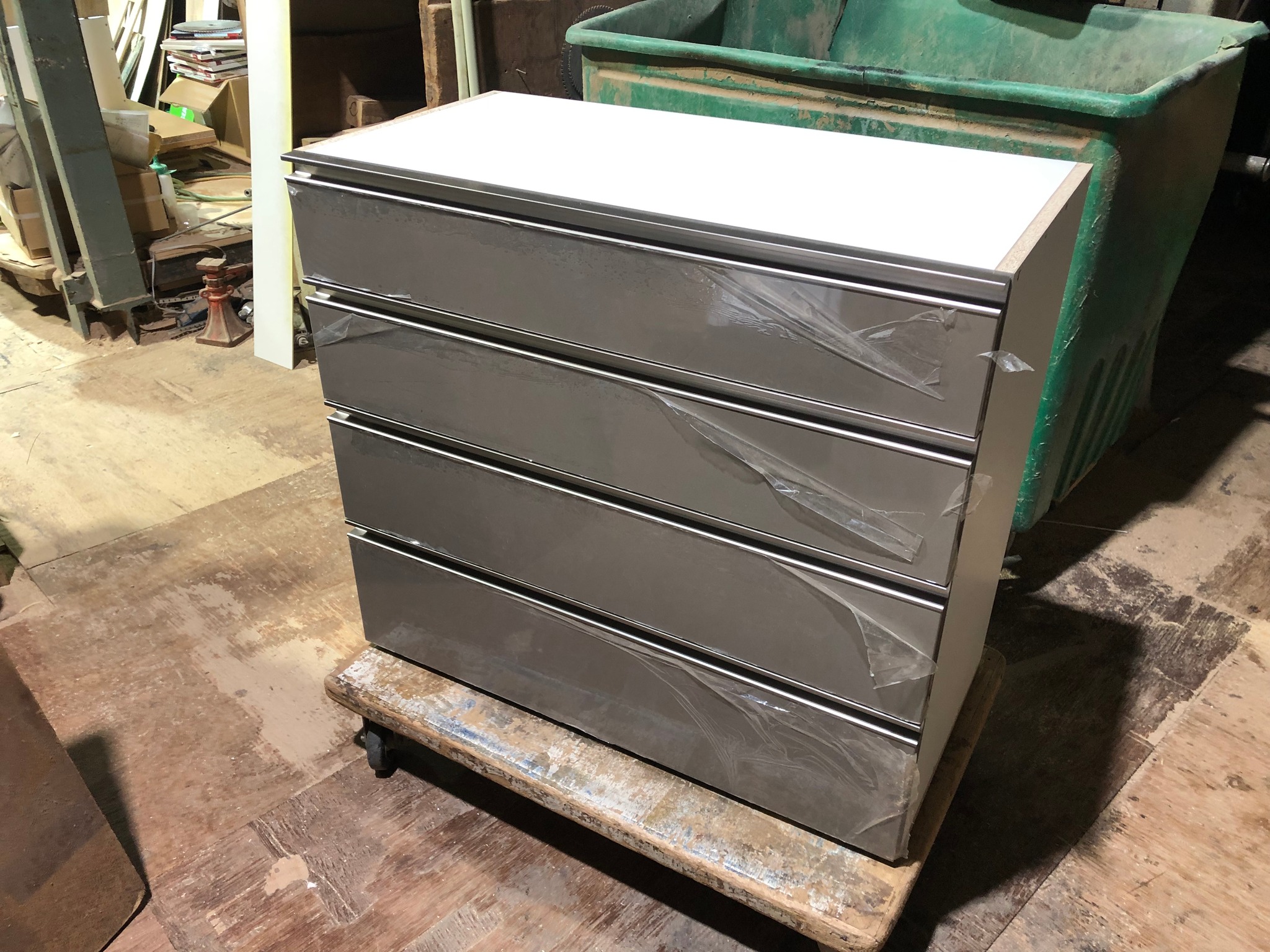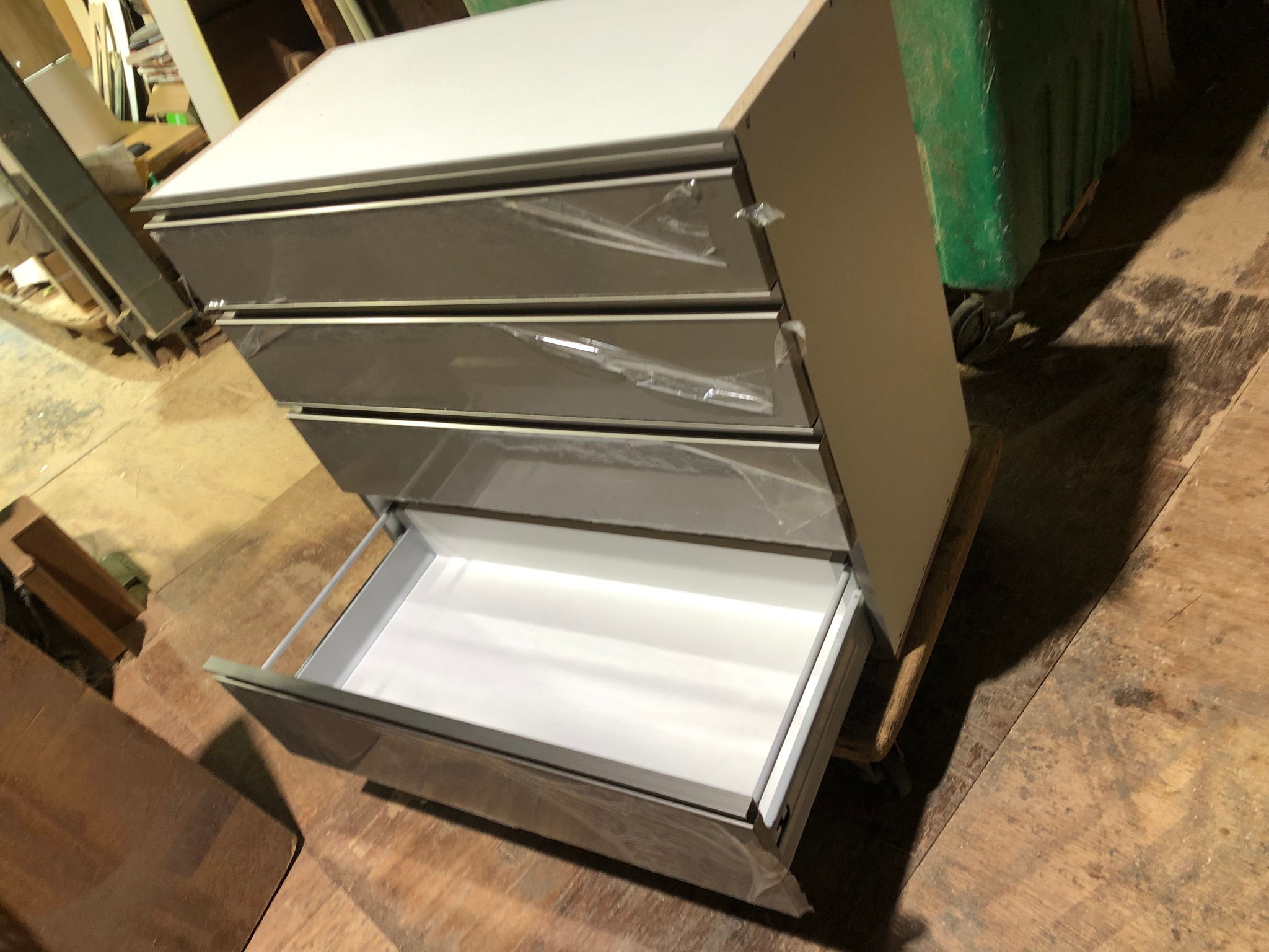 引出し箱の取り付けも行いました。鏡面のポストフォーム扉でメーカー製作の扉にレール引き手を取り付けて本体にセットしました。明日も引き続き扉の吊りこみ作業を行います。